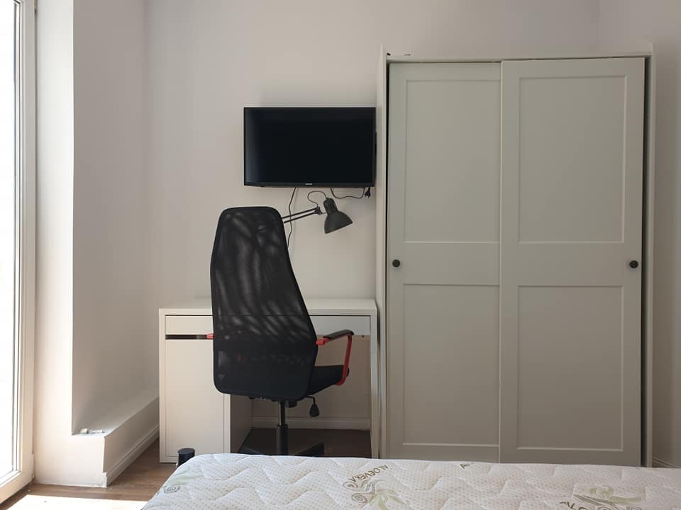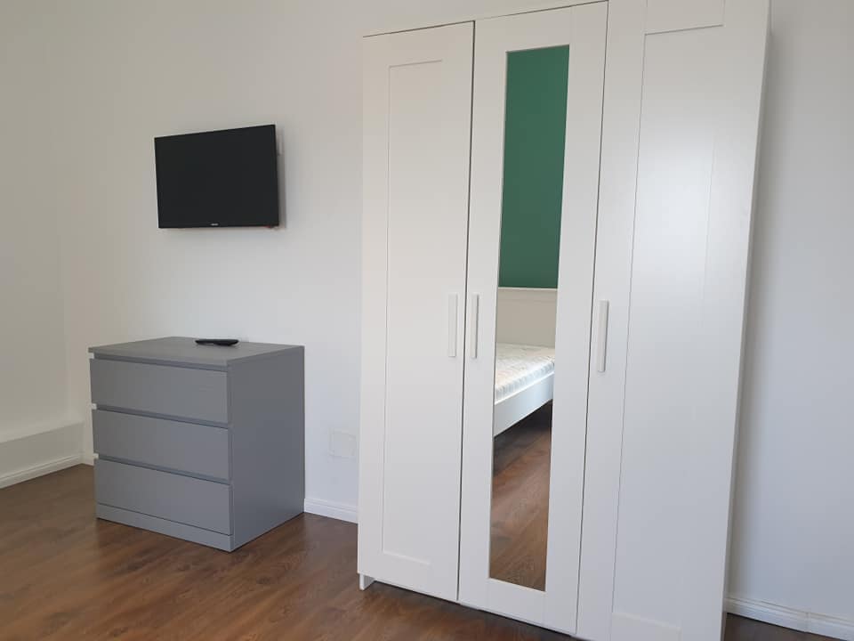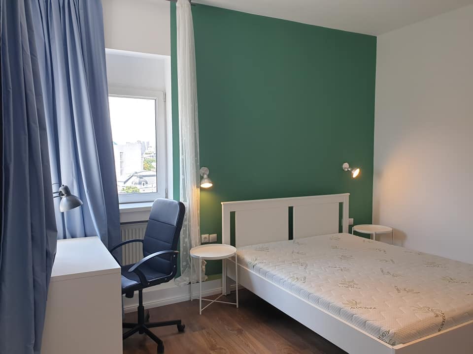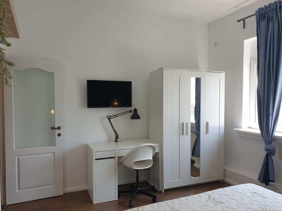 Each room has a bed, a desk and a wardrobe.